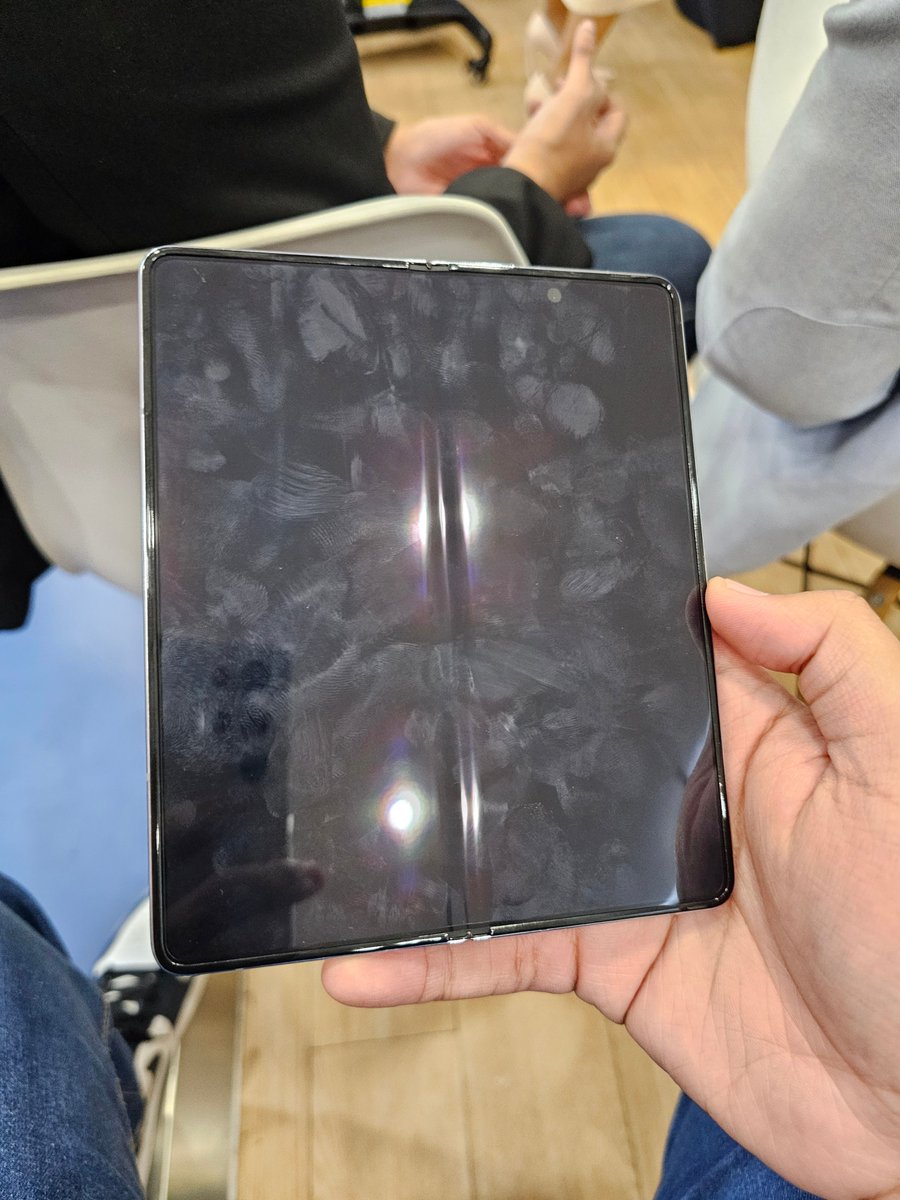 Samsung, вероятно, предоставила прессе и другим представителям СМИ коммерческие устройства Galaxy Z Fold 5, чтобы они попробовали его и увидели разницу с предыдущим устройством. Пользователь Х (Твиттер) Элвин поделился фотографиями внутреннего дисплея смартфона, причем на первом изображении видно, что панель выключена, и хотя он утверждает, что не успел почистить дисплей, снизу видна складка, идущая почти до верхней части экрана. Похоже, что Samsung столкнулся с препятствием в этом моменте, и теперь устранение складок на экране кажется невозможным.